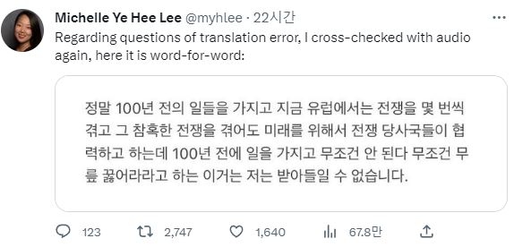 Michelle Ye Hee Lee 기자는 녹음원문을 공개했습니다. 이로써 인터뷰논란에 대해서는 종지부를 찍을 수 있게 되었으나 여야 막론하고 사회 각 계층에서는 대통령의 역사의식에 문제점을 인식하지 않을 수 없게 되어 씁쓸함만 남기게 되었습니다. 아무쪼록 이번 방미일정에서 좋은 성과가 있기를 기대합니다.