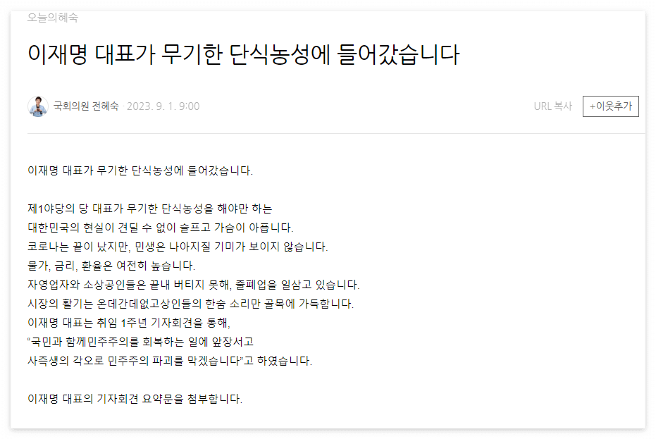 위와 같이 즐겁게 행사가 진행되는 순간에도 당대표는 검찰출석을 하면서도 단식투쟁을 이어가고 있다. 주변의 만류에도 불구하고 단식을 계속 유지해 나가겠다는 뜻을 내보였지만 매우 건강상태가 좋아 보이지 않는다.