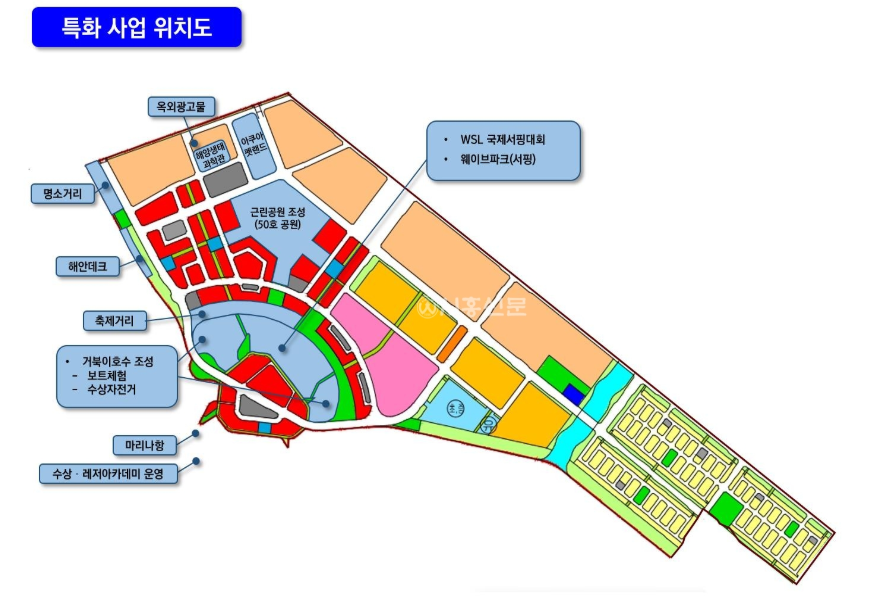 - 2018~2022년 (이재명 지사): 2018년 웨이브파크 MOU 체결, 2019년 기공식, 2020년 개장으로 세계 최대 인공서핑장이 들어섰다. 이는 거북섬의 관광 활성화를 위한 핵심 시설이었다.