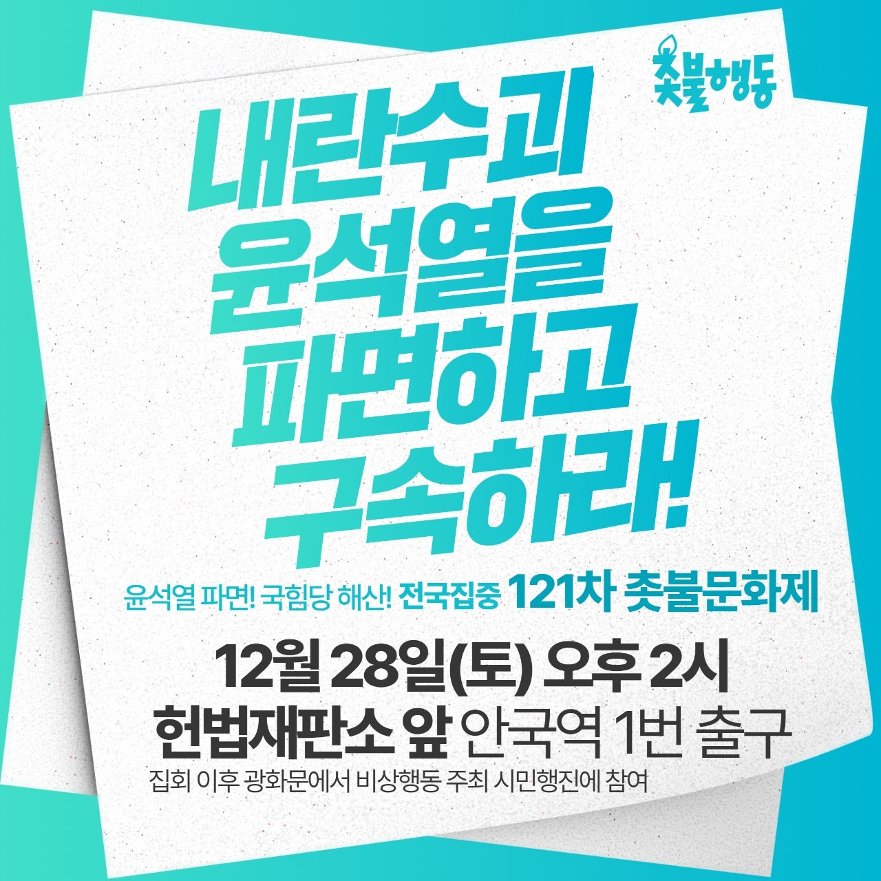 이제 조금 지나면 윤석열 내란일당이 내란을 시도한 후 한 달이 되어 갑니다. 국회에서의 탄핵절차는 이루어냈지만 아직 3명의 헌법재판관 임명을 하지 못한 상황입니다. 거기에는 우둔한 한덕수 총리와 국무위원들의 버티기 전략이 있습니다. 그리고 대한민국 역사의 영원한 빨갱이 국민의 힘 당이 그 중심에 서 있습니다. 윤석열 파면을 위한 촛불행동에 관한 정보를 알려드립니다.